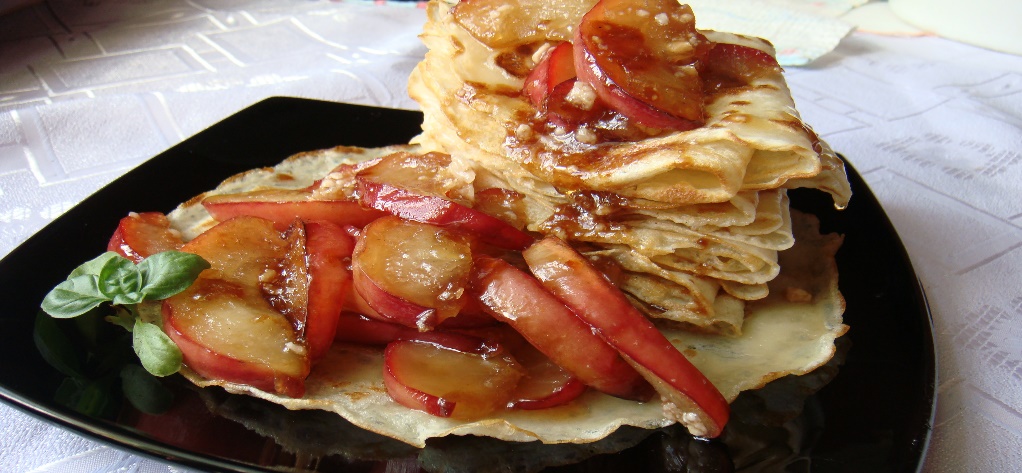 Яблоки очистить и нарезать ломтиками. В сковороде растопить сахар, добавить сливочное масло и красное вино, положить яблоки в один слой, потушить в сахарном сиропе, перевернуть на вторую сторону, снова потушить несколько минут (яблоки должны стать мягкими, но сохранить форму), снять со сковороды, гарнировать блинчики, посыпать корицей.