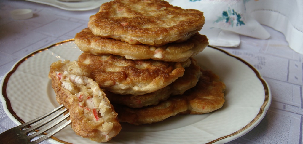 Пивные блины можно приготовить с припеком из рыбы или крабовых палочек. В этом случае технология их приготовления может быть следующая – на разогретую сковороду выложить столовую ложку теста, на него разложить кусочки рыбы или крабовых палочек, а сверху прикрыть припек еще ложкой теста.