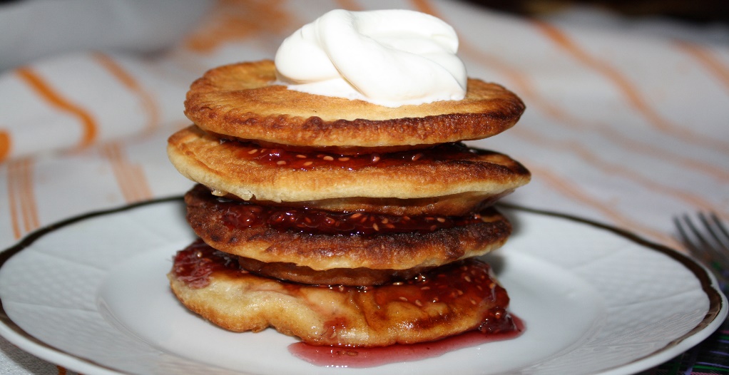 250 мл молока, 2 яйца, 0,5 чайной ложки соли, 1 чайная ложка сахара, 0,3 чайной ложки питьевой соды, 1 чайная ложка светлого винного уксуса, 2 столовые ложки растительного масла, 5-6 столовых ложек муки (тесто консистенции густой сметаны), около 100 мл густого варенья, около 100 мл сметаны.