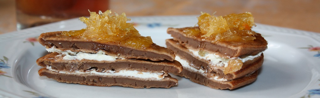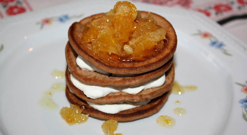 Блины смазать творожной начинкой, сложить пирожными (по 2 или 3-4 штуки), сверху на каждую стопку блинов положить по чайной ложке цитрусового соуса и сразу подать.