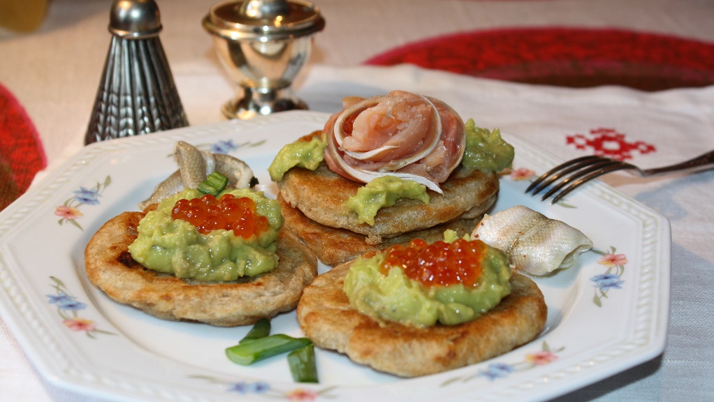 130-140 гр муки, около 350 мл молока, 2 яйца (от размера яиц, их веса и качества муки, зависит количество молока), 1 чайная ложка сахара, соль по вкусу, 1 столовая ложка растительного масла, 50 гр охлажденного сливочного масла, 200 гр соленой семги, 50 гр красной лососевой икры, 2 столовые ложки рубленой пряной зелени (по вкусу), 1 чайная ложка сока лимона, ½ лимона.