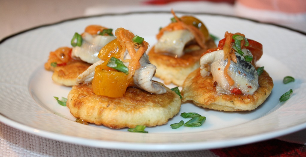 Яйцо вместе с солью и сахаром взбить в пышную пену. Взбитое яйцо влить в муку, туда же добавить закваску, укроп или другую зелень, молоко и перемешать. Тесто накрыть пленкой и оставить в теплом месте для брожения (обычно около 0,5 часа). Подошедшее тесто приправить перцем, вымешать и оставить при комнатной температуре еще на полчаса. Разогреть сковороду для выпечки блинов, подмазать маслом, выложить тесто ложкой, смоченной водой. Выпекать оладьи с двух сторон до корочки. Блины выложить на тарелку в один ряд, гарнировать анчоусами, перцем и морковью. Готовое к подаче блюдо посыпать зеленым луком и сразу подать на стол.
