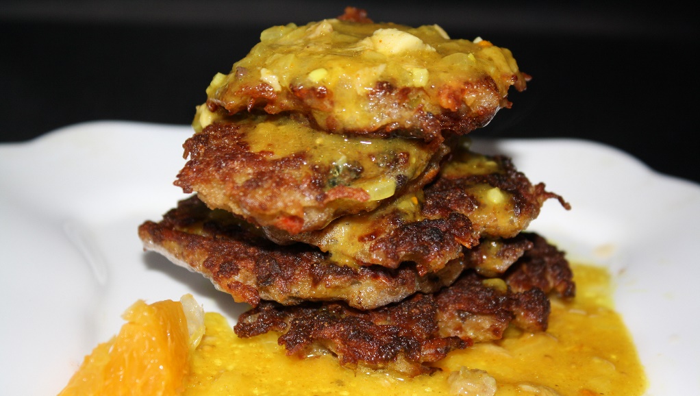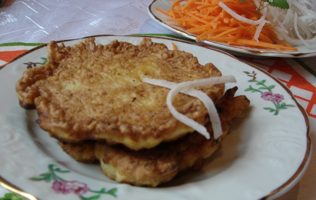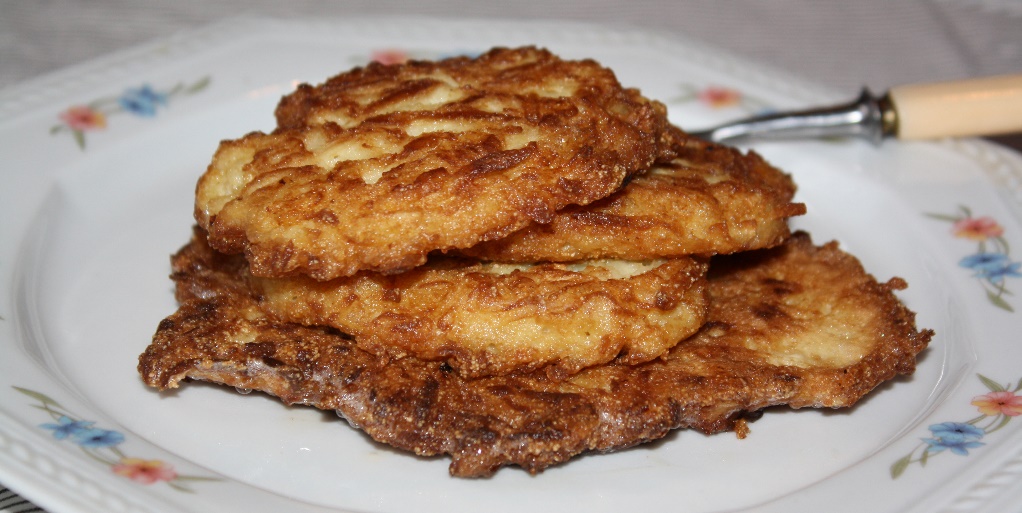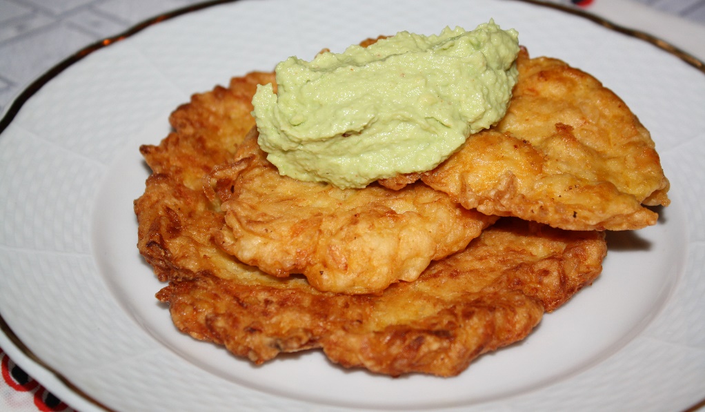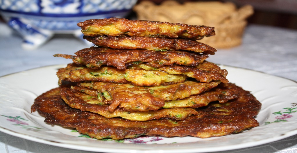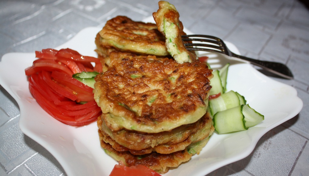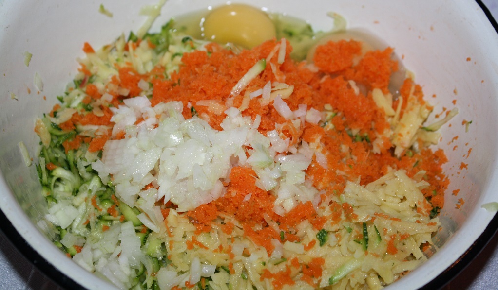 500 гр картофеля, 500 гр кабачков (патиссонов, тыквы), 2 яйца, 1 луковица, 2 столовые ложки рубленой зелени лука, 3 столовые ложки муки, соль, перец по вкусу, 100 мл растительного масла. Яйца взбить со щепоткой соли.