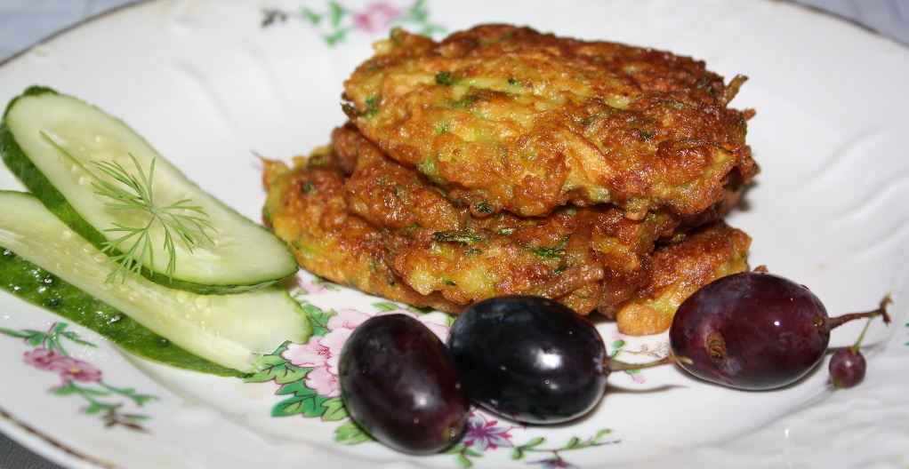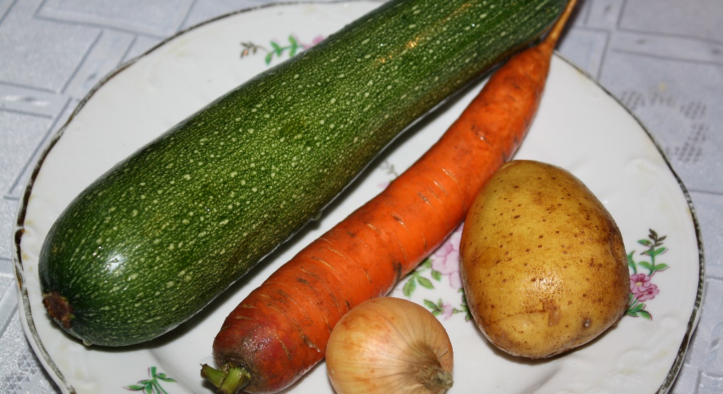 450 гр молодых кабачков, 150 гр картофеля, 100 гр моркови, 50 гр репчатого лука, 2 яйца, около 100 гр муки, 1 кофейная ложка пищевой соды, погашенной 1 кофейной ложкой винного уксуса, соль по вкусу, около 50 мл растительного масла для жарки оладий.
