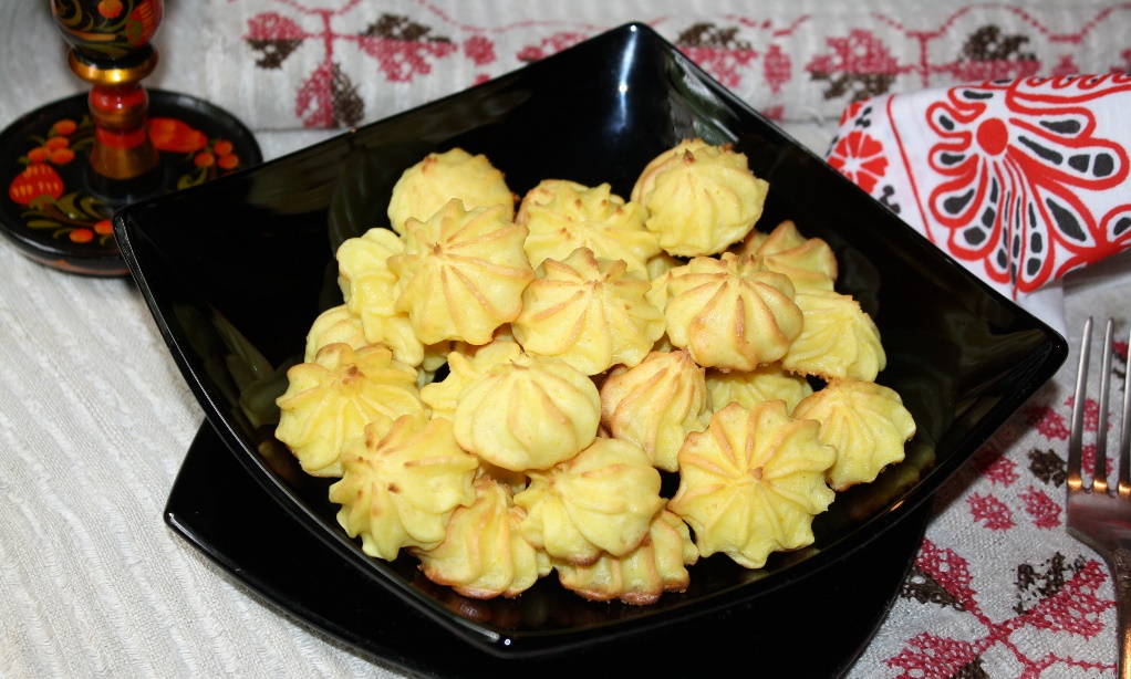 Кефир в упаковке положить на 12 часов в морозильную камеру. Упаковку снять, замерзший кефир подвесить в марлевом мешочке до полного удаления (стекания) сыворотки (около 10 часов). Картофель очистить, отварить в подсоленной воде до готовности, отцедить, подсушить на горячей плите в кастрюле без крышки. Картофель размять, взбить в гладкое пюре, остудить до теплого состояния. К теплому картофельному пюре добавить приготовленный творог, посыпать шафраном и перцем чили, тщательно вымешать. Яйцо со щепоткой соли взбить в пену. Крахмал просеять. В картофельно-творожное тесто влить яйцо, перемешать, всыпать крахмал и тесто хорошо вымесить. Противень смазать растительным маслом и обсыпать хлебными крошками. Картофельное тесто переложить в кондитерский шприц и отсадить кусочки на противень. Запекать бульбяники около тридцати минут в разогретой до 180*С духовке. Подавать как самостоятельное блюдо или в качестве гарнира к мясу или рыбе.