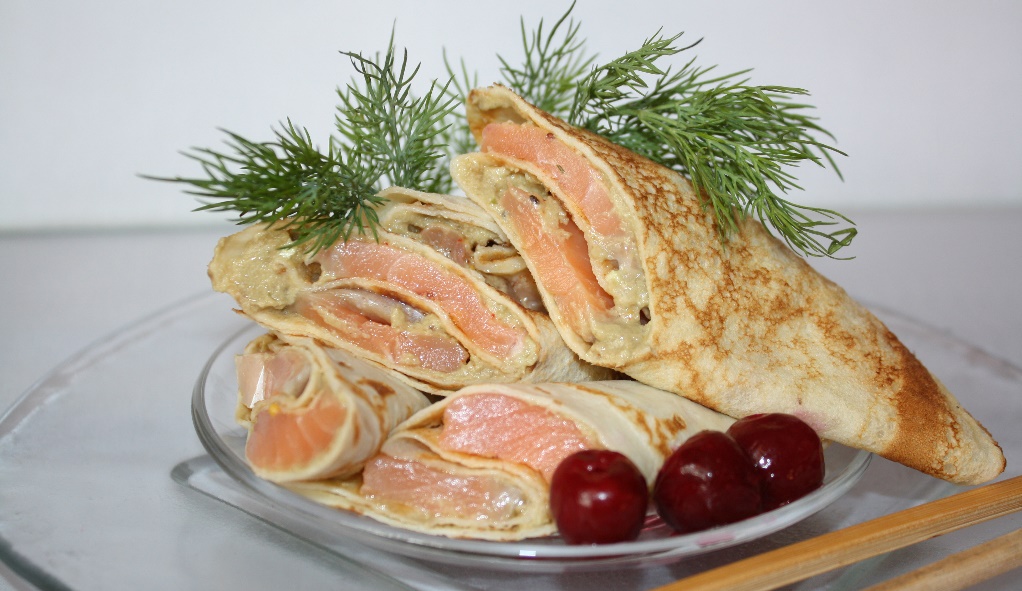 На каждый блинчик выложить полоску рыбы, свернуть блинчик рулетом и разрезать пополам. Половинки блинчиков выложить на тарелку, икру подать отдельно.