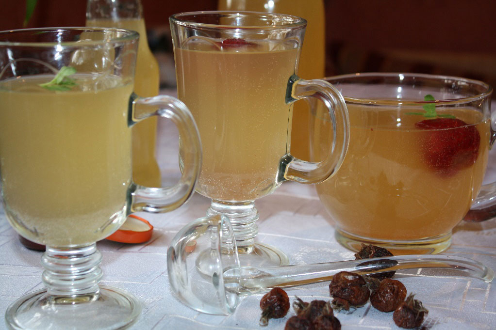 6 литров свежего березового сока, 4 столовые ложки сахара, по 10 шт сушеных плодов шиповника, боярышника и свежеобжаренного кофе, 1 чайная ложка растворимого кофе, 20 ягод изюма, 1 столовая ложка сбора травяного чая (листья брусники, малины, земляники, мяты, цветы бессмертника, зверобоя.
