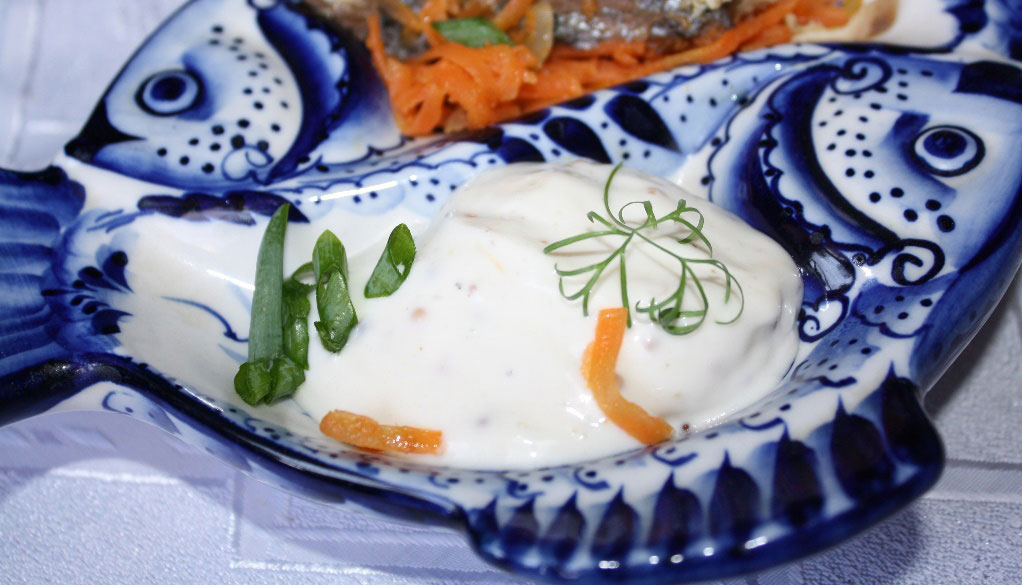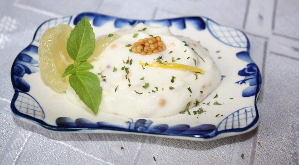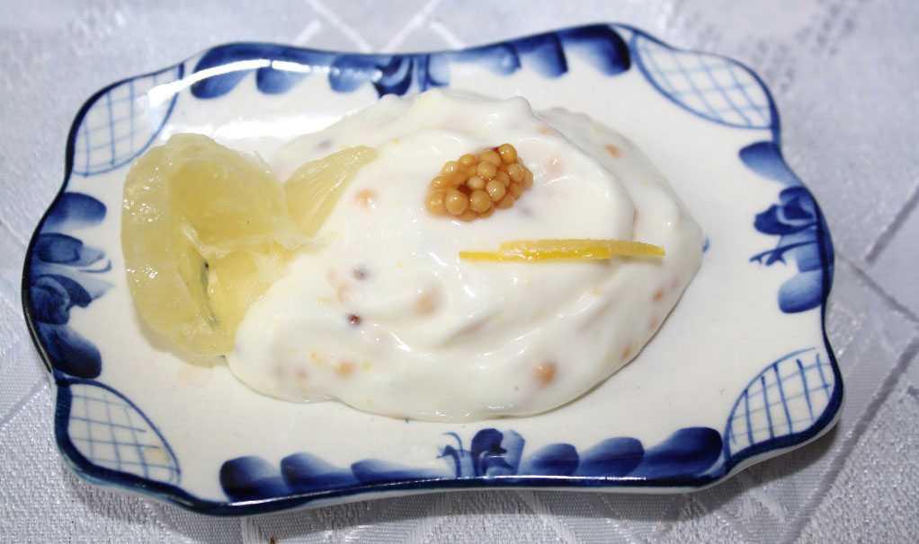 150 мл растительного масла, 70–80 мл сливок 10 %, щепотка соли, 1 чайная ложка сахара, 3 чайные ложки сока лимона, 2–3 полоски цедры лимона (предварительно выдержанного в кипятке 5–7 минут), горчица из зерна по вкусу.