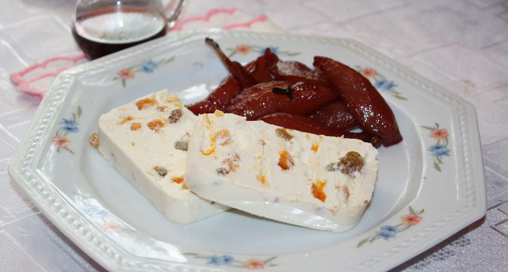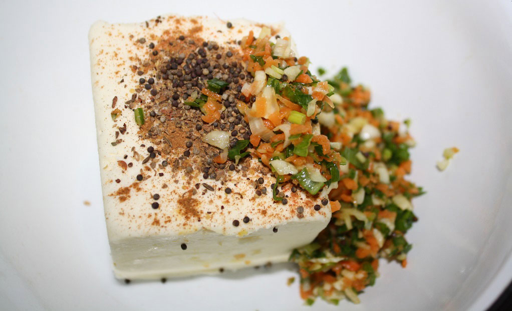 Творог завернуть в марлю и на ночь оставить под грузом. Пропустить через мясорубку с паштетной решеткой.