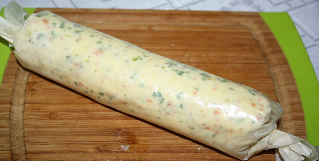 Масло выложить валиком на пергаментную бумагу, сформовать цилиндром. Края бумаги завернуть как обертку конфеты.