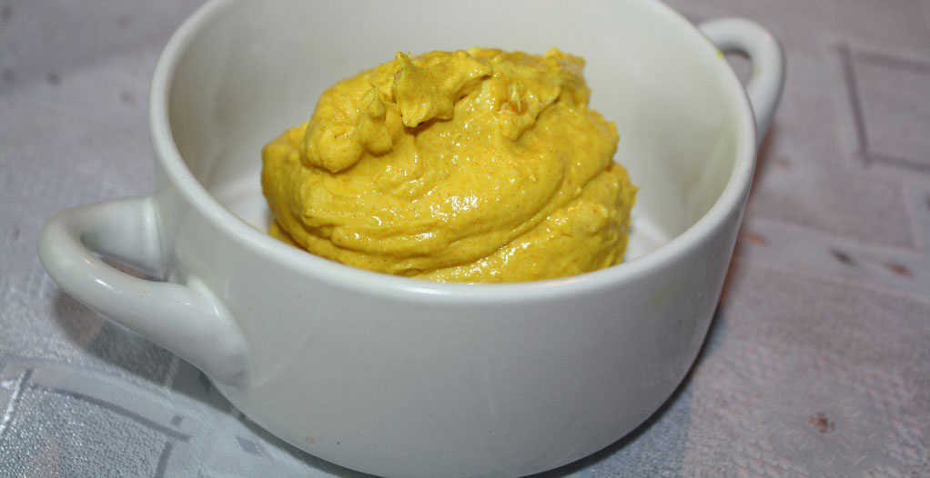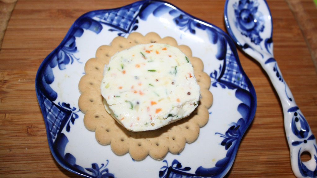 100 гр масла жирностью более 70 %, 20–30 гр твердого сыра, 1 зубчик чеснока, чайная ложка куркумы, щепотка молотого перца чили, щепотка морской соли.