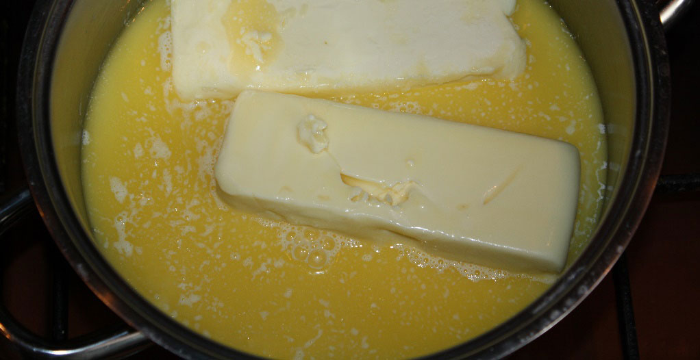 Масло переложить в 3-х литровую кастрюлю с толстым дном, медленно нагревая, растопить.