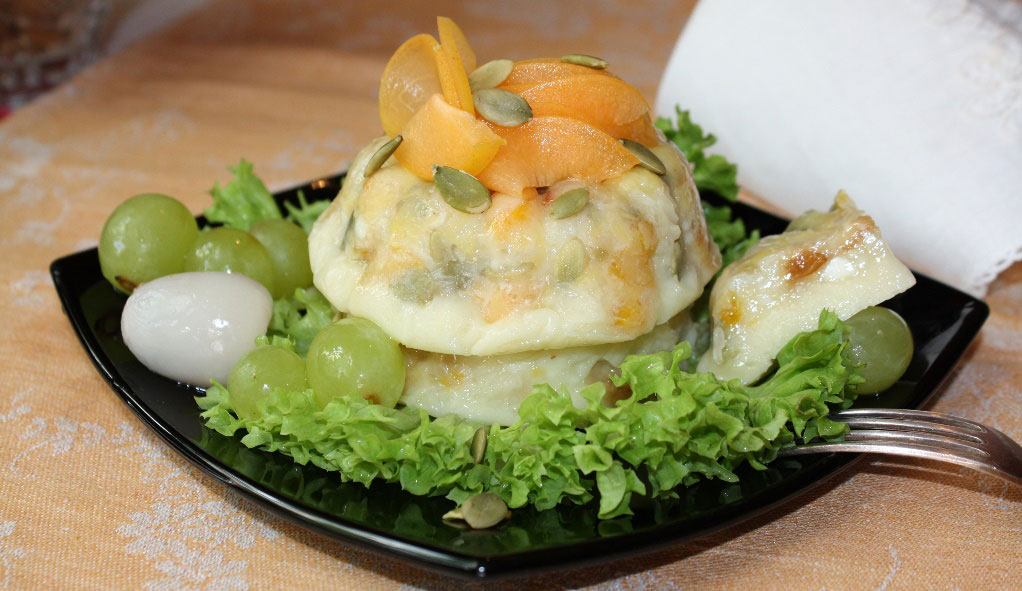 350 гр хорошо отжатого творога, 1 кофейная ложечка питьевой соды, щепотка соли, 40–50 гр сушеных слив или груш, 10–20 гр тыквенных семечек (или подсолнечник), 40 гр сливочного масла, керамические формочки или мисочки.