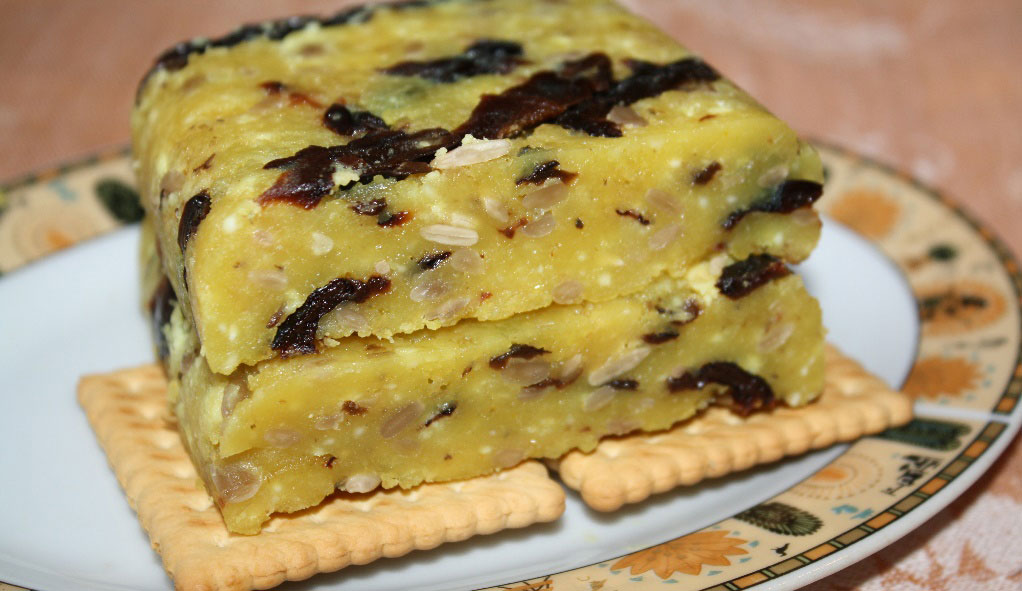 Сковороду с толстым дном или сотейник разогреть без жира на медленном огне, ровным слоем выложить творог, посыпать содой, помешивая нагревать, пока творог расплавится и загустеет. Творожную массу посолить, вмешать остатки оставшегося сливочного масла, сухофрукты и семечки, перемешать, разлить в формочки. Остудить до комнатной температуры и охладить в прохладном месте.
