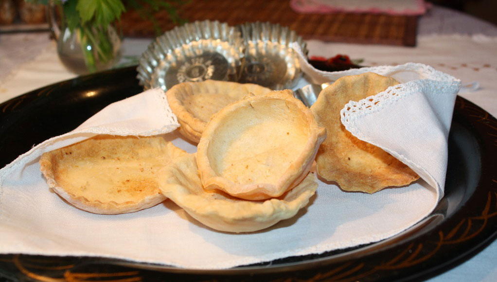 Разогреть духовку до 220–230*С, сушить тарталетки 2–3 минуты, вынуть из духовки, сразу снять с противня и разложить в один слой на рабочей поверхности.