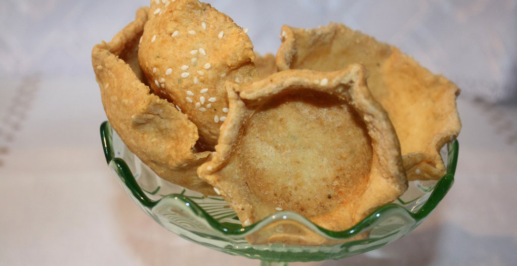 Из муки, взбитого яйца, кефира, масла, сахара и соли замесить тесто, выдержать 15–20 минут, раскатать, посыпать кунжутом, прикатать. Далее можно использовать технологию приготовления тарталеток с тмином (вместо воды для смазки формочек нужно использовать растительное масло).