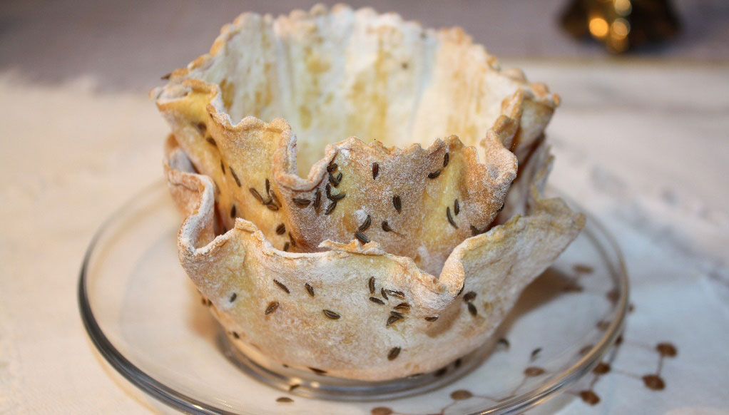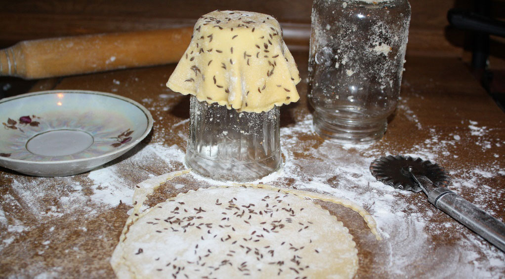 На посыпанной мукой рабочей поверхности стола раскатать тесто в тонкий пласт, посыпать тмином, прокатать скалкой, вырезать кружочки, надеть на формочки и плотно прижать. Формочки с тарталетками расставить на противень.