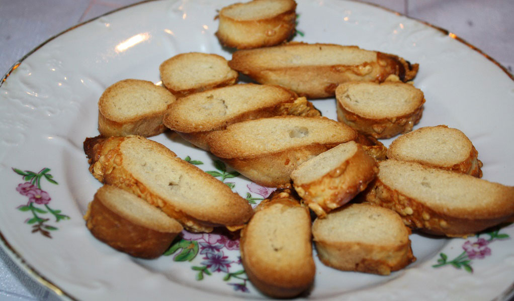 Булочки нарезать косыми ломтиками толщиной около 1 см, разложить на противень, выстеленный бумагой для выпечки, фольгой или силиконовым ковриком.
