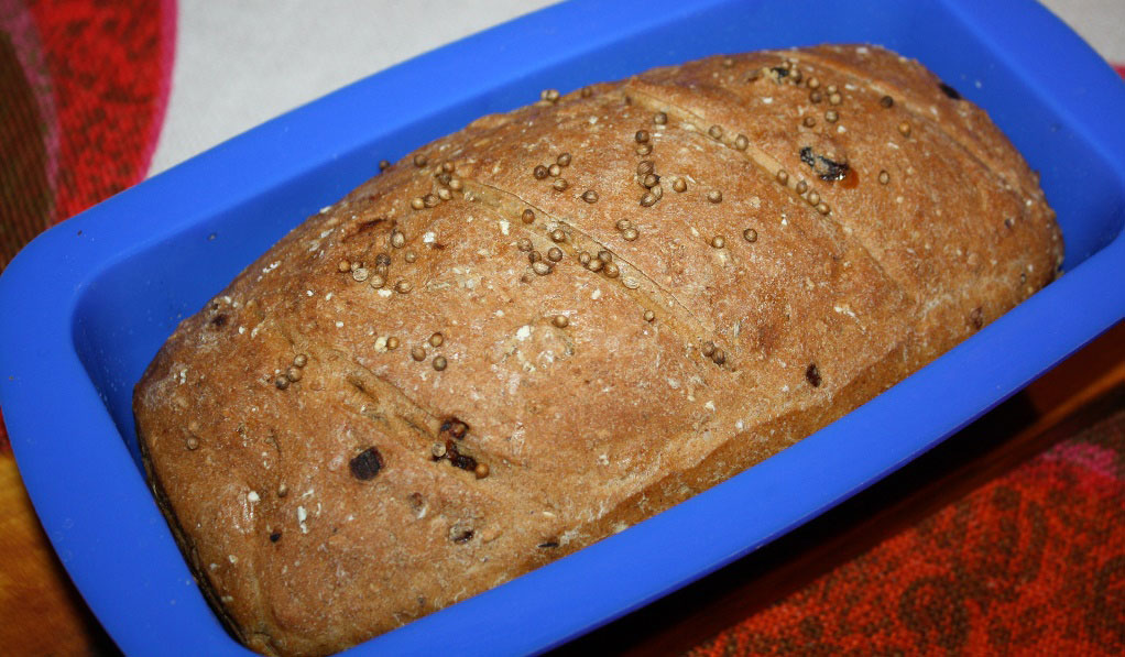 3 столовые ложки зерновых хлопьев (овес, пшеница, ячмень, рожь, греча или др.), около двух столовых ложек семян подсолнуха (тыквы или орехов), по щепотке целых зерен тмина и кориандра, 0,5 чайной ложки смеси растертых в крошку зерен горчицы, тмина и кориандра, 1 столовая ложка растительного масла, около 250 мл воды, соль, сахар по вкусу (можно без них, потому что изюм и финики придадут хлебу сладость, а пряности и семечки – вкус).