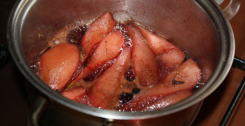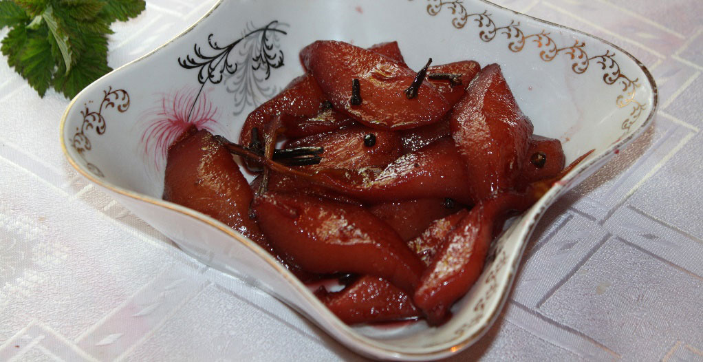 Для пьяных груш: 350–400 гр груш, около 250 мл красного сухого вина, 2 столовые ложки сахара, 2 чайные ложки ванильного сахара, 0,3 чайной ложки корицы, по 3–4 штуки гвоздики, душистого и черного перцев.