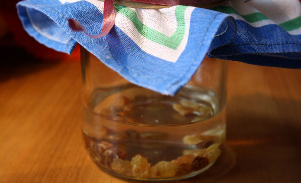 Изюм промыть, залить 150 мл воды, обвязать салфеткой и поставить в теплое место на 3 суток.