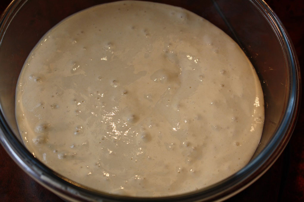 Из 100 гр муки и 100 мл воды, настоянной на изюме, замешать жидкое тесто, переложить в высокую банку (кастрюлю или контейнер), обвязать влажной салфеткой (чтобы тесто не подсыхало сверху) или натянуть пленку и поставить в теплое место.
