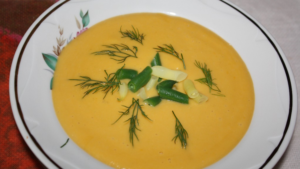разлить в тарелки, гарнировать спаржевой фасолью, оформить веточками укропа.