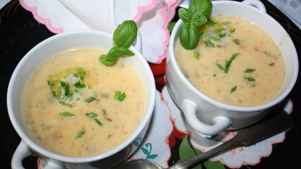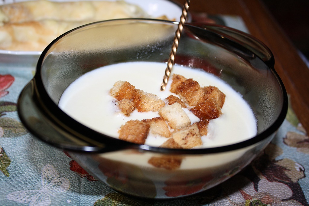 О,5 л молока, 5-6 столовых ложек сухой смеси для картофельного пюре (загустить суп можно приготовленным отдельно картофельным пюре, кукурузным или картофельным крахмалом или манной), около 40 гр плавленого сливочного сыра. Кроме того: около 100 гр белого хлеба, 1-2 чайные ложки растительного масла, щепотка корицы, 4 фаршированные творогом с сухофруктами блинчика, около 100 мл молока, 20-30 гр сливочного масла, 1 столовая ложка сметаны.