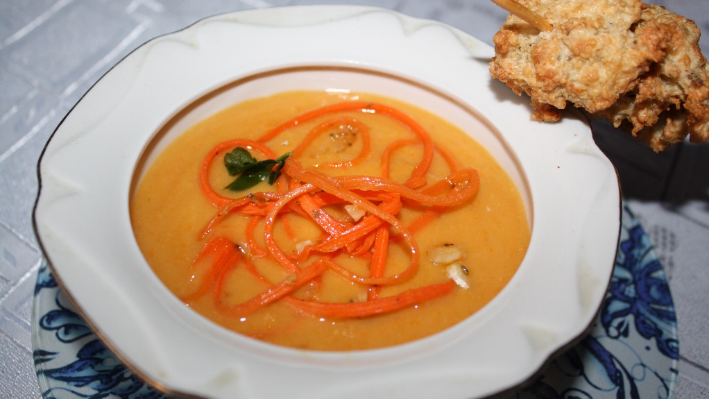 300 гр моркови, 150 гр картофеля, 100 гр тыквы, 100 гр молодых кабачков, 30 гр лука-порея, 100 гр корнеплода сельдерея, 50 мл куриного бульона фюме, около 300 мл сливок 10%, соль по вкусу, около 50 гр маринованной моркови.