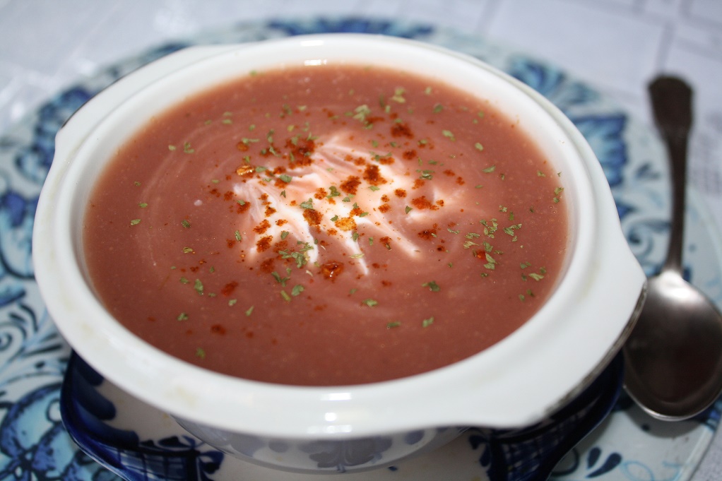 200 гр отварной свеклы, 150 гр картофеля, 100 гр моркови, по 50 гр цветной капусты, брокколи, репчатого лука, отварных грибов, 500 мл бульона из фасоли, 100 мл сливок, соль, пряности по вкусу.