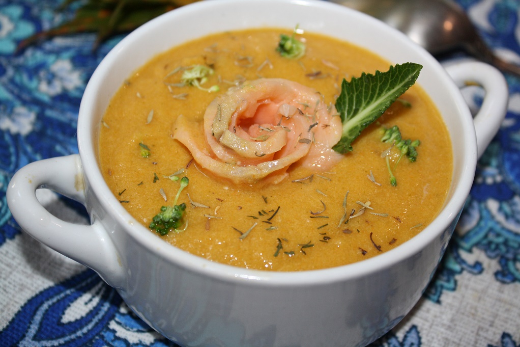 Суп разлить в тарелки, гарнировать соленым лососем.