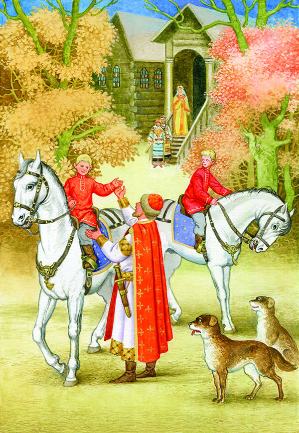 Быстро годы летят. Вот уже стоя́т на крыльце два мальчика в новых рубашечках, узорными поясками подпоясаны. Народу полон двор, и все на них глядят. Что такое? А это – четыре года прошло, настала пора княжичей на коней сажать, посвящать в воины. Были они до сих пор на руках у мамок-нянек, и волосы им с рождения не стригли – кудри у обоих до плеч отросли. Потому и назывался этот обычай – «по́стриги».