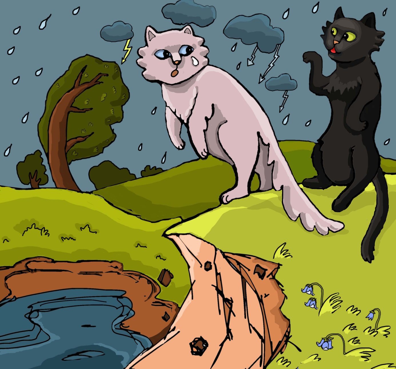 Матвей взял старый сломанный зонт и, хлопнув картонкой, которая заменяла ему дверь, вышел на улицу. Выбравшись на дорогу, он стал поджидать незнакомца около большой лужи. Вскоре тот доковылял и до неё. Это был толстый молодой кот с грязной шерстью, мокрый от кончика хвоста до ушей. Вид у него был жалкий и беспомощный. С низко опущенной головой, не видя Матвея, кот подошел к луже и прошептал: