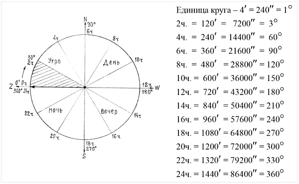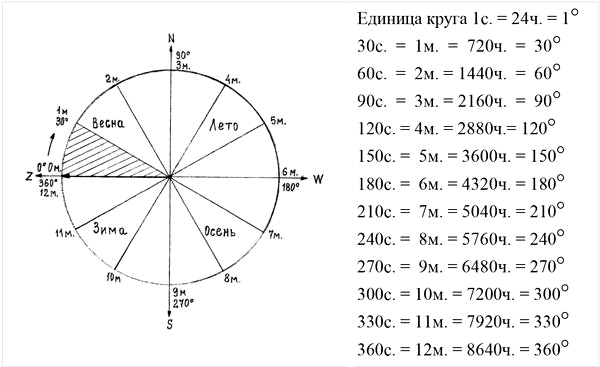 На рисунках 2 и 3 мы видим, что каждый круг-циферблат разделен системой прямоугольных координат на верхнюю (северную) и нижнюю (южную), восточную и западную половины. Они также разделены на четыре равные четверти. На первом круге четыре четверти соответствуют четырем частям суток – утро, день, вечер и ночь. На втором круге четыре четверти соответствуют четырем климатическим сезонам – весне, лету, осени и зиме. Кроме этого, каждый круг разделен на двенадцать 30-градусных отрезков по количеству зодиакальных созвездий, на фоне которых движутся главные наблюдательные объекты Земли – Луна и Солнце. Из центра каждого круга проведен начальный радиус в точку запада. Именно от точки запада поворотом начального радиуса около центра круга по часовой стрелке начинается отсчет углов и времени. За единицу измерения углов принят угол в 1 градус.