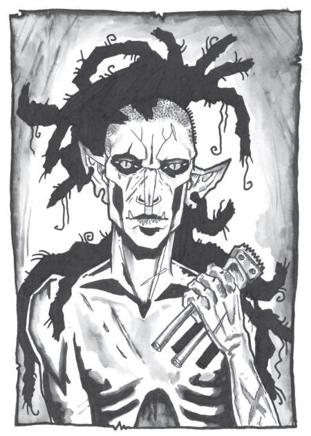 Густая короткая щетина на скальпе стоит торчком, цветом в чёрный перец, круто пересыпанный с солью. От лба наискось к макушке видны три длинных голых рубца, и ещё один чертит башку из-под рваного уха.