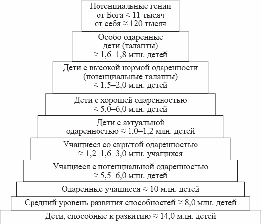 На 1–2 миллиона актуально одаренных детей приходится 6–7 миллионов подростков со скрытой и потенциальной одаренностью (5,0–5,5 к 1). Из 10 актуально одаренных детей, став взрослым, может быть поистине талантливым 1 (гений от себя).