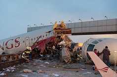 После выключения двигателей, за счет торможения при движении по снежному покрову за пределами ВПП и наезду на неровности, произошло одновременное обжатие левой и правой основных опор шасси. Обжатие основных опор шасси привело к автоматическому выпуску воздушных тормозов и интерцепторов, а также к перекладке створок реверсивных устройств двигателей. Столкновение самолета со склоном оврага произошло с путевой скоростью около 190 км/ч.