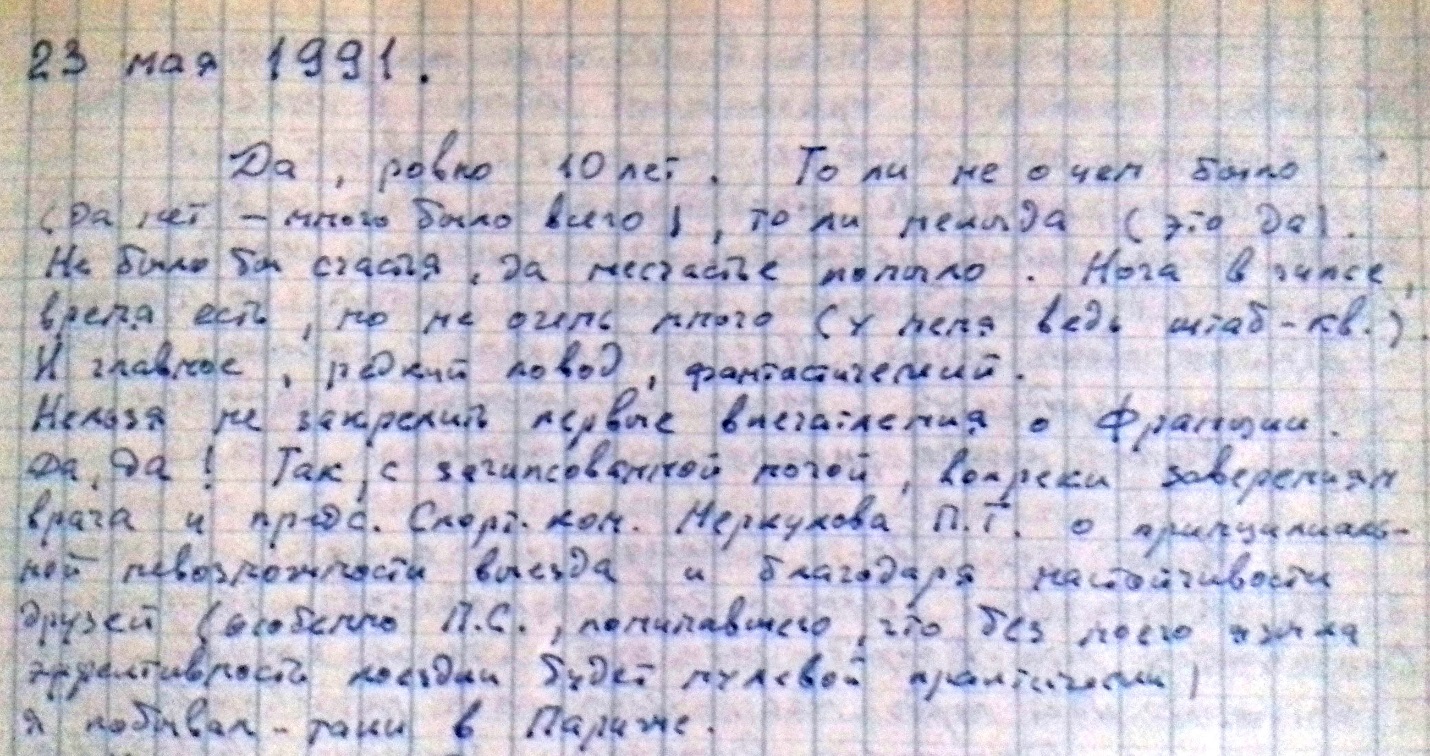Сегодня 23 мая 1991 г. Обнаружил тетрадку с давними записями 80-х годов о рыбалке. Да, ровно 10 лет. То ли не о чем было (да нет – много было всего), то ли некогда (это да!). Но не было бы счастья, да несчастье помогло. Нога в гипсе, время есть, но не очень много (у меня ведь штаб-квартира). И, главное, редкий повод, фантастический. Нельзя не закрепить первые впечатления о… Франции. Да, да! Так, с загипсованной ногой, вопреки заверениям врача и председателя спорткомитета Меркулова Павла Тихоновича о принципиальной невозможности выезда больных спортсменов и благодаря настойчивости друзей (особенно Пал Саныча Протопопова, понимавшего, что без моего языка эффективность поездки будет практически нулевой), я побывал-таки в Париже.