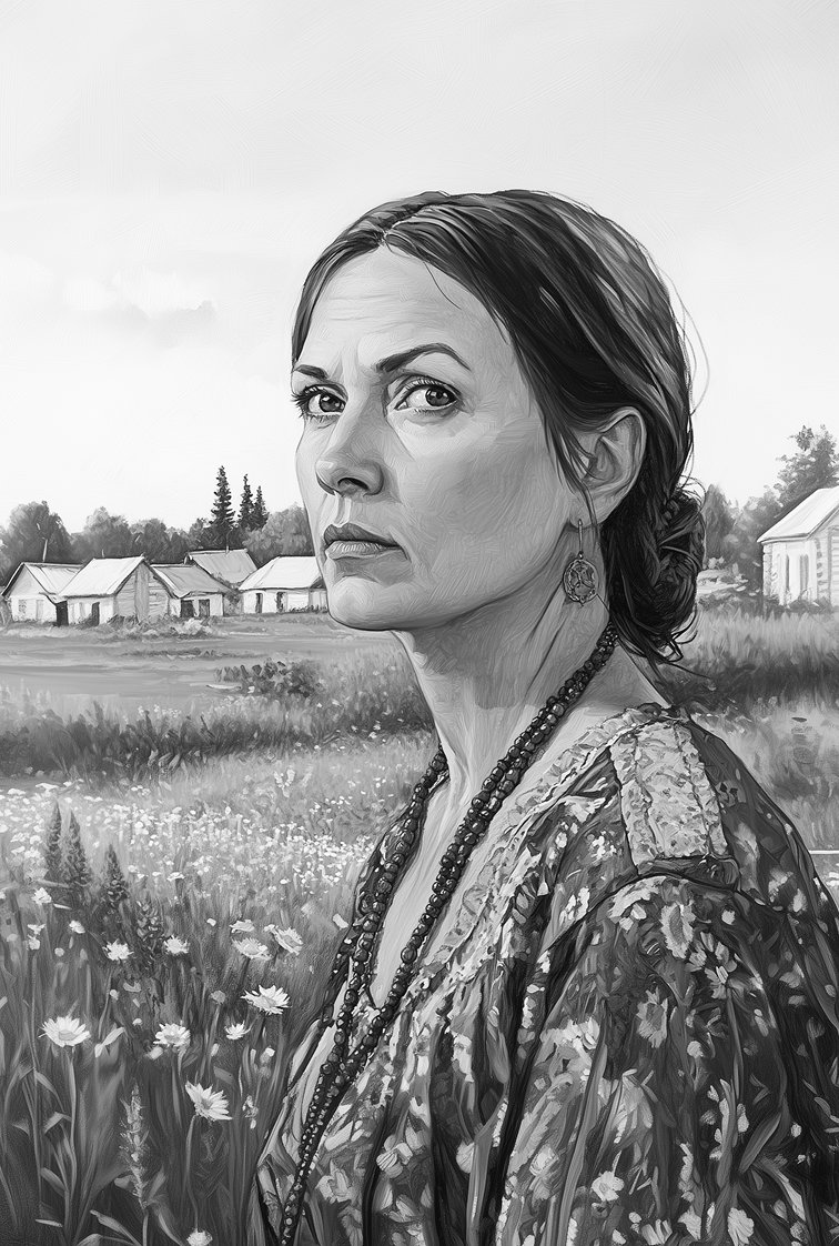 Знойный день. За селом, у обочины дороги, стоит пожилая женщина.