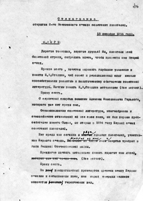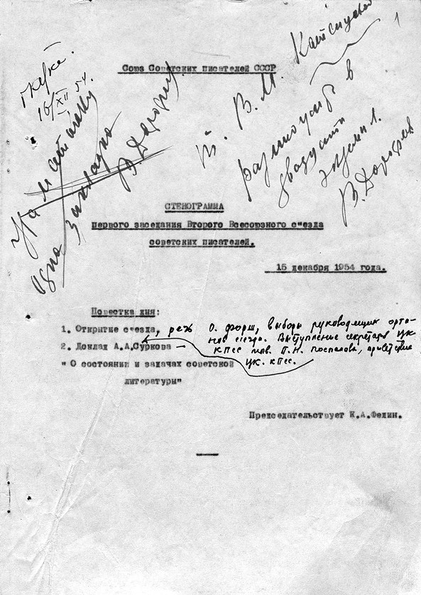 Не считая репортажей в текущей прессе и напечатанных отдельными брошюрами выступлений ведущих докладчиков, выпущенный в свет спустя полтора года стенографический отчет является основным из опубликованных источников, по которым можно судить о том, что происходило и что говорилось на съезде. Стенографический отчет (Второй Всесоюзный съезд советских писателей. 15–26 декабря 1954 года: Стенографический отчет. М.: Советский писатель, 1956) был сдан в набор 31 декабря 1955 года, а подписан к печати 19 мая 1956-го, то есть уже после XX съезда КПСС, который состоялся в феврале.[6]