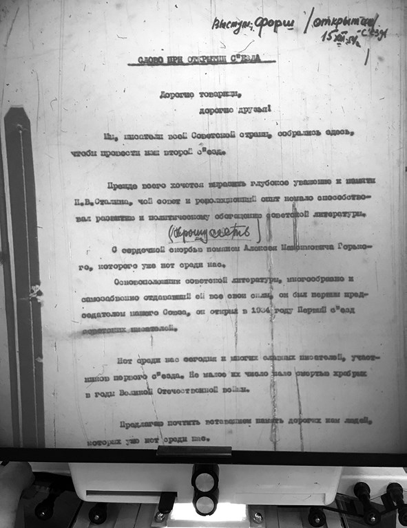 Впрочем, эти стенограммы как незыблемое свидетельство тоже проблематичны, поскольку первоисточника – текста, который записывался непосредственно во время выступлений, – среди них нет. В фонде сохранились лишь машинописи, сделанные на основе отсутствующей стенограммы, а также разнородные материалы, предоставленные самими писателями после выступлений.