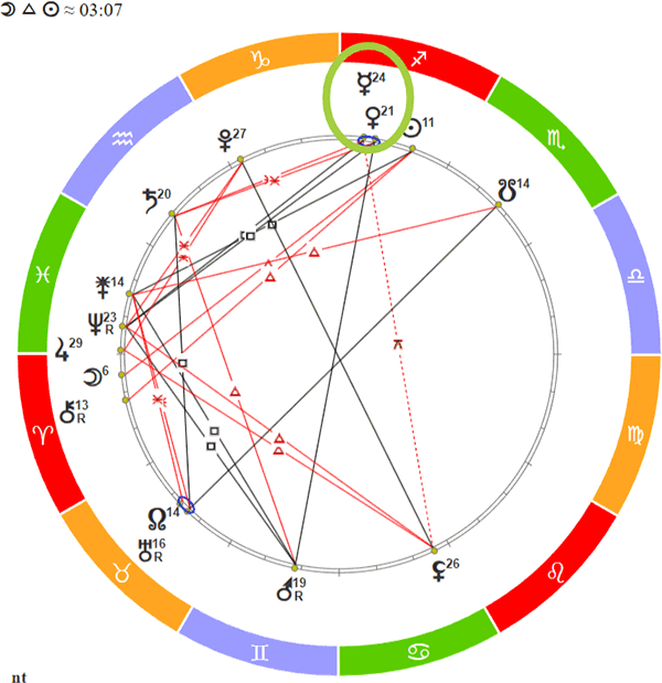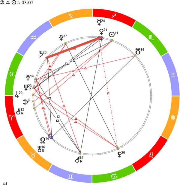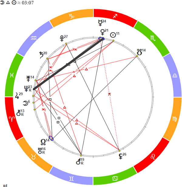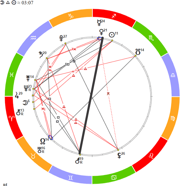 У обоих приятные Луны во Льве, практически в одних градусах, поэтому я специально пометила, какая кому принадлежит. Несмотря на примостившийся рядом Уран, брак гармоничный, об изменах ничего неизвестно, в громком скандале пара оказалась замешана только из-за общего сына, подсевшего на наркотики.