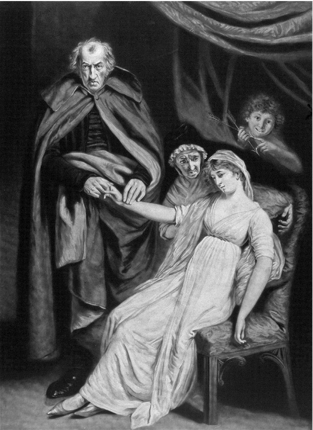 На картине английского романтика Джона Опи (1761–1807) «Влюбленная дева, или Озадаченный доктор» («The Lovesick Maid, or the Doctor Puzzled», см. на с. 6) изображена диагностическая сценка, которая с различными модификациями разыгрывалась в русской художественной литературе на протяжении всего XIX века. На холсте запечатлен врач средних лет, который измеряет пульс меланхоличной девушки в присутствии двух других персонажей – пожилой женщины (вероятно, матери пациентки) и Купидона, притаившегося на заднем плане. Присутствие Купидона не оставляет сомнений в природе «медицинского» расстройства девушки, о котором идет речь. Однако картина Опи – это не просто иллюстрация единичного случая любовного недуга, это каноническое изображение любовных страданий как медико-культурной парадигмы, которая, как показывает это произведение искусства, к началу XIX века уже была устоявшейся и обладала своими неотъемлемыми, легко идентифицируемыми атрибутами1.