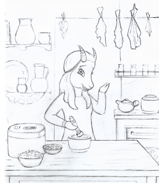 这里的空气是如此的清新,空气中充满了草药的气息:这些草被绑成束悬挂在墙上。瓦列拉只认出几样,看到第五束草时让他感到了困惑,认不出来这到底是哪种草,瓦列拉等着女主人提供点心,而玛尔法只是笑了笑说:“自己喝茶,你又不是第一次来我家。” 然后她把草药捣碎,把沙拉放在桌子上:“瓦列拉,吃不吃这个?从花园里种植的蔬菜中提取出来的,天然无污染对人很有益。” 瓦列拉看了看果断拒绝了,还是只想喝茶,不想填饱肚子。玛尔法哼了一声,问了一句:“你都知道我的厨房里有些什么东西,自己做去泡茶。” 瓦列拉起身走到烧水壶那,那里没有简单泡的茶,却有无数的草。选择哪一个呢?玛尔法向瓦列拉点了一下头说:“你可以从圣约翰草开始泡,它可以杀死有害细菌。” 瓦列拉烧开了水,然后他问了自己一个问题:哪种草可以减肥?“玛尔法,请给我食谱!” 玛尔法回答道:“这种食谱给你很容易,但是瓦列拉,你完全不了解草药的用途,他们不是用于减肥。”