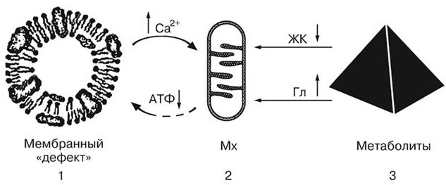 Рис. 1. Первичная гипертензия. Вариант предполагаемой связи нарушений мембранной регуляции внутриклеточного Ca2+ энергообразовательной функции митохондрий (2) и метаболических нарушений (3), лежащих в основе проявлений метаболического синдрома [Постнов Ю. В., 2000]