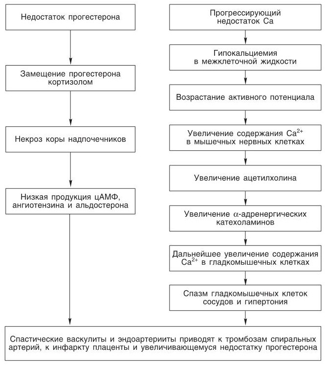 Недостаточность Са, которая в I половине беременности, наряду с другими факторами, приводит к истощению коры надпочечников, усугубляется во II половине беременности вследствие повышенной потребности в Са со стороны растущего скелета плода и вследствие повышения объема на 1/3 материнского метаболизма.