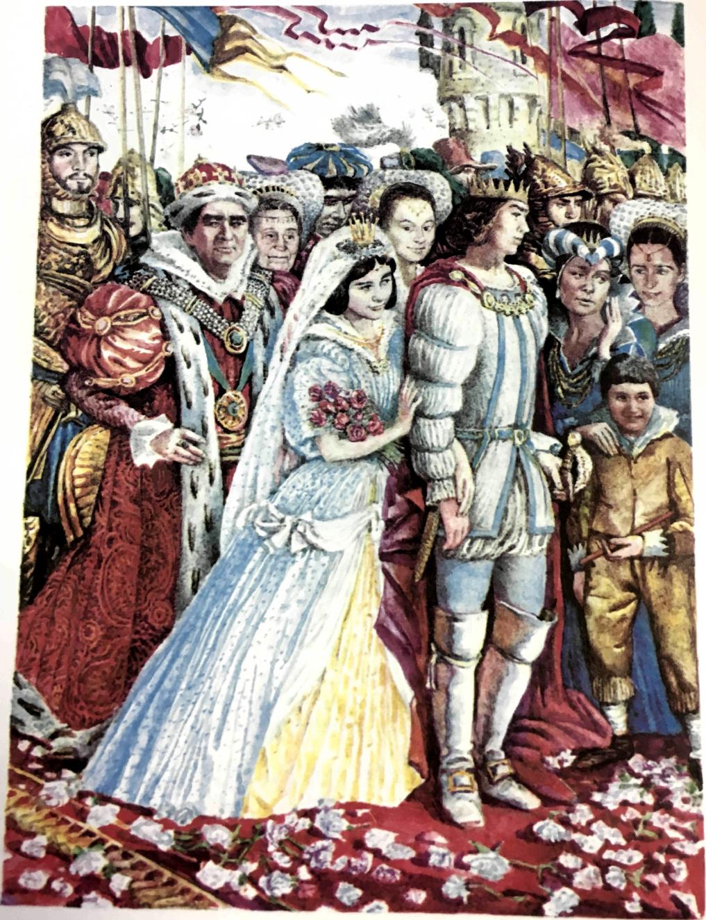 Народу было много, и казалось, что все жители королевства пришли на свадьбу Белоснежки и принца Арли. Вокруг замка стояли огромные столы, уставленные самыми изысканными яствами и винами. Возле столов слуги ожидали условного знака о начале пира. Но не угощенье занимало внимание гостей. Взгляды всех устремились на золоченые двери дворца, откуда должны были появиться Белоснежка и ее возлюбленный.