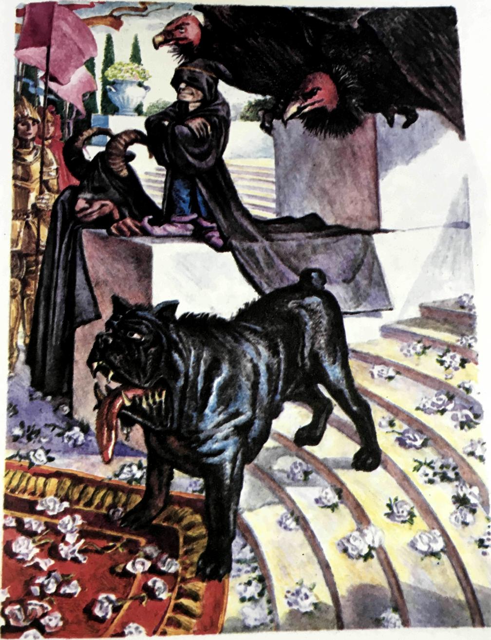 Это действительно была большая черная собака необычной породы. Когда она поворачивала голову, с ее желтых клыков на землю капала слюна. Создавалось впечатление, что у зверя сильный насморк. Колдовские чары сковали присутствовавших, и никто не мог шевельнуть даже пальцем. В полной тишине странные гости подошли к Белоснежке…