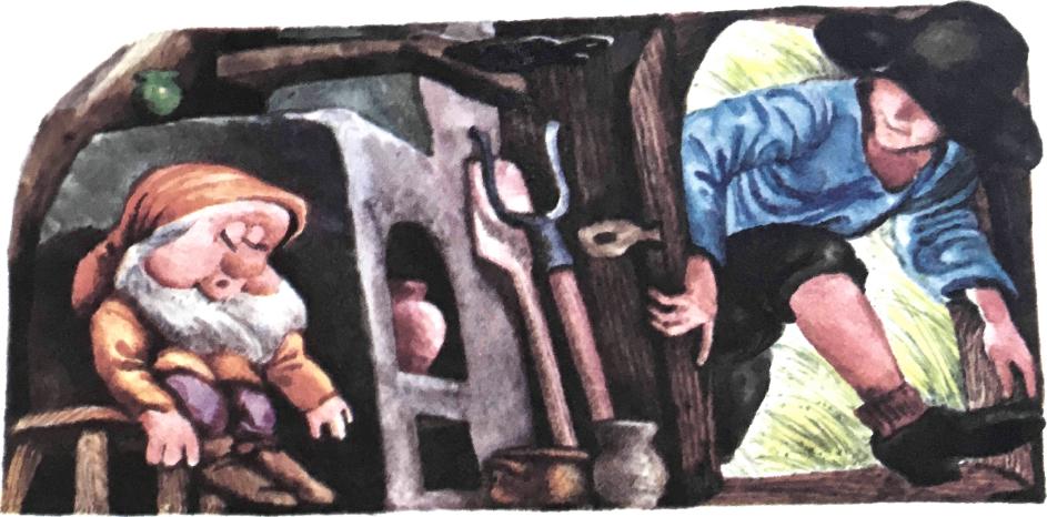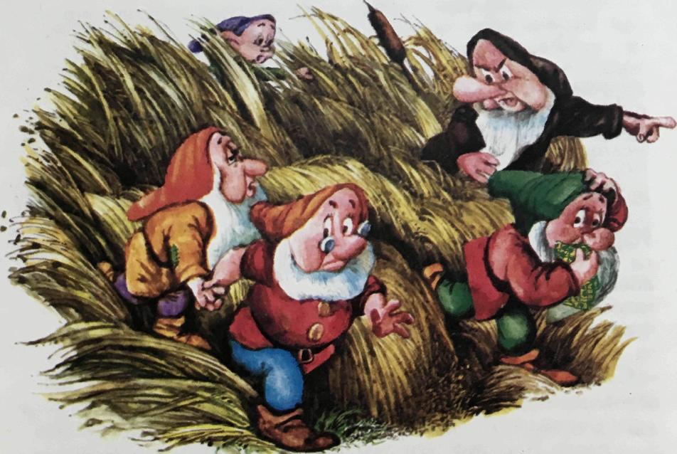 Главного гнома звали Мастером Доком, потому что он очень много знал и больше всего на свете любил объяснять, как и что нужно делать. У него было шесть помощников. Брюс, прозванный за постоянное ворчанье Ворчуном. Арчи Чихун, не выносивший запаха перца и корицы. Пит Молчун, признававший единственную мудрость для себя: «Слово – серебро, молчание – золото». Весельчак Джу, получивший свое имя за веселый характер. Уилли Соня, который мог спать где и когда угодно – лишь бы никто не мешал. Однажды он даже уснул стоя. И последний, Простак, у которого было только одно имя, совпадающее с его прозвищем. Как-то его спросили: «Почему у тебя одно имя?». «А зачем мне два? – удивился Простак. – Это слишком сложно».