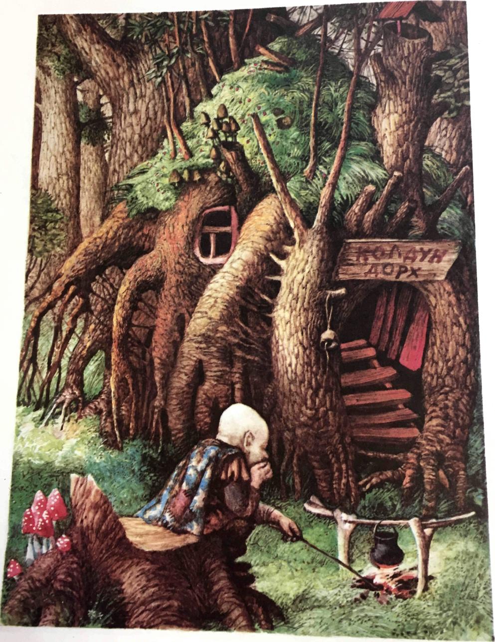 Дом волшебника был небольшим, но на вид очень крепким. Приземистый, с остроконечной круглой крышей, он казался незаметным на фоне окружавших его деревьев. Рядом с домом на пеньке сидел хозяин. С первого взгляда гномам стало ясно, почему его прозвали Яйцеголовым. Лысая голова Дорха напоминала куриное яйцо, повернутое острым концом вверх.